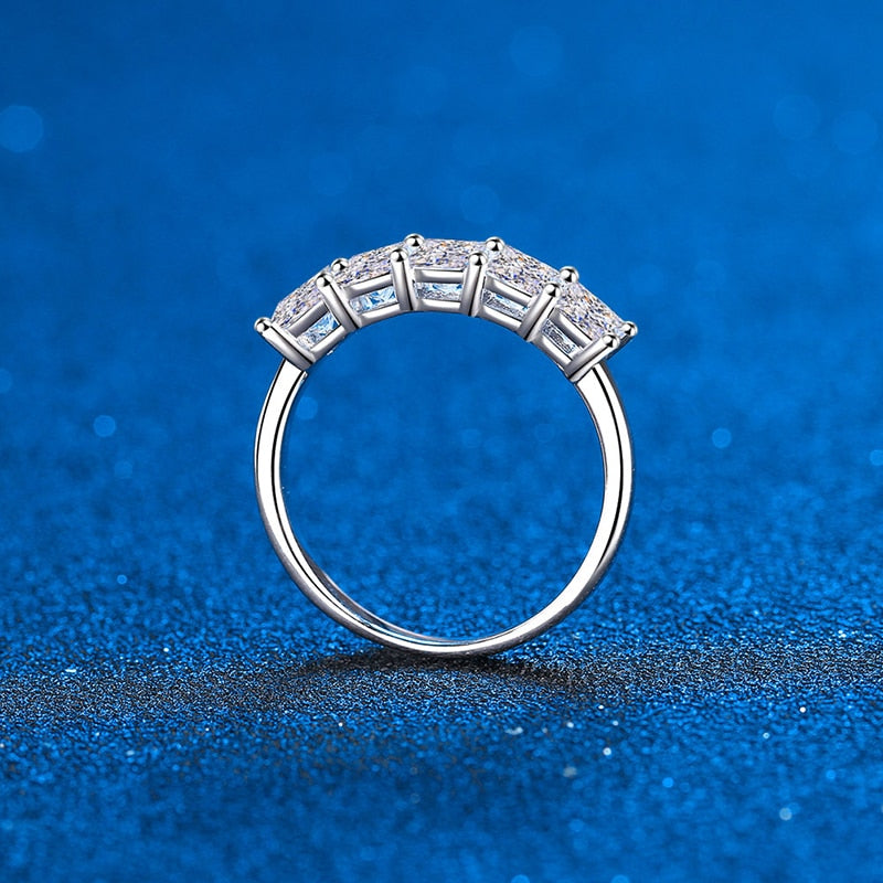 The centerpiece features a stunning arrangement of five Princess Brilliant-cut diamonds, each measuring 4.75 mm and collectively boasting a total carat weight of 2.0-carat. These diamonds are graded D color for exceptional brightness, VVS1 clarity for remarkable purity, and an excellent cut for maximum brilliance and sparkle.